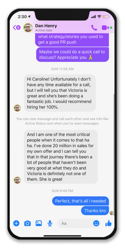 I hired her to get me press. And when she got me to press, it did a lot of things for my business. But as soon as I had that press when we applied to get the verification on both, they said okay, and it’s weird because I’ve done a lot of things that you would think would get you verified huge audience, hundreds of thousands of followers, but because I didn’t have the right press, those things didn’t happen. And so she got me the right press. And as a result, not only did that happen, but you don’t realize how many things can happen and how much credibility you get in your business when you have a legitimate credible press. -Dan Henry